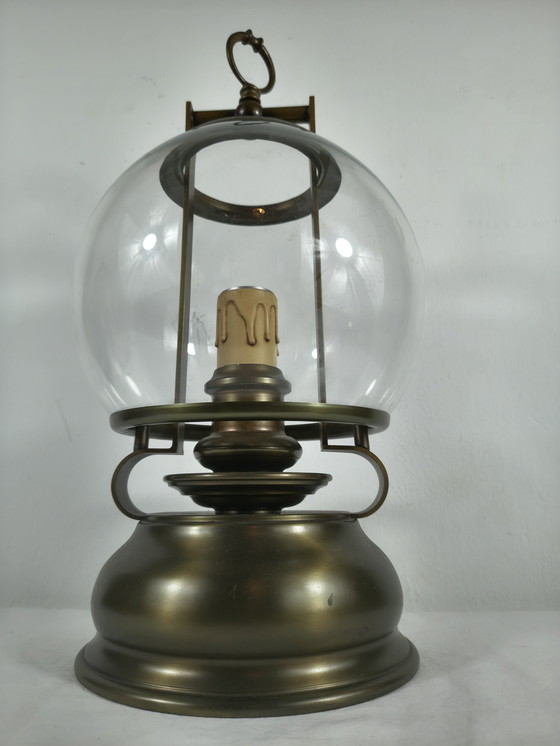 Lampe de table lanterne vintage en laiton avec globe en verre et porte-bougie