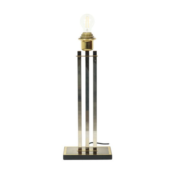Lampe de table vintage en laiton et chrome, à trois piliers, signée Willy Rizzo pour Lusterie Deknudt (Belgique), années 1970. Étiquette du fabricant apposée sous l'abat-jour.