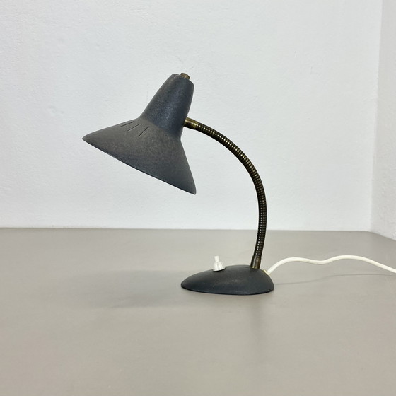 Article : lampe de table moderniste en métal gris et laiton Origine : Italie Décennie : 1950s Cette lampe vintage originale a été conçue et produite dans les années 50 en Italie. La lampe est en métal gris et laiton avec une forme élégante de style hollywood regency. La base de la lampe a une belle taille de 27 cm de haut, avec un joli abat-jour sur le dessus. Design simple et minimaliste de l'ère du design des années 1950. Cet article est un ajout merveilleux à toute maison moderne. Dimensions de la lampe : Hauteur 27cm Profondeur 15cm Longueur 23cm Condition : bon état vintage, avec une patine liée à l'âge. Quelques rayures de surface.