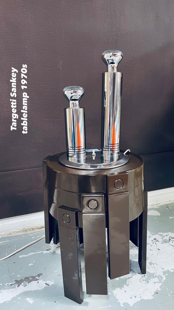 Cette lampe de table vintage Targetti Sankey des années 1970 est une véritable pièce de collection. Son design épuré et moderne, sa structure métallique de haute qualité et sa finition argentée brillante apportent une touche d'élégance à n'importe quelle pièce. Sa forme cylindrique unique et sa double ampoule en font un objet remarquable pour les amateurs de design. Idéale pour ajouter une note vintage à votre décoration.