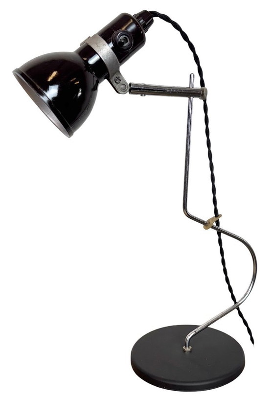 Cette lampe de table réglable a été fabriquée dans l'ancienne Tchécoslovaquie dans les années 1970. Elle est dotée d'un abat-jour en bakélite avec interrupteur d'origine, d'un bras chromé et d'une base en fer. La douille fonctionne avec des ampoules standard E14. Câble textile neuf.