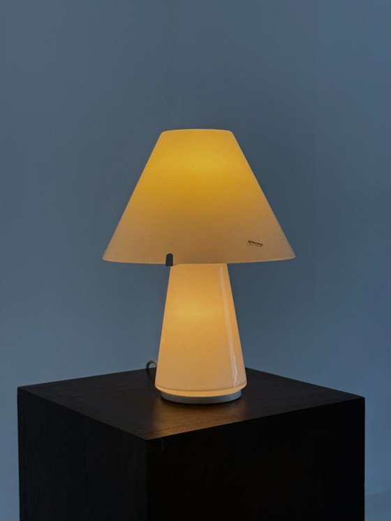 Petite variante de la lampe de table italienne vintage conçue par Carlo Nason pour AV Mazzega. Cette lampe emblématique est fabriquée en verre de Murano blanc et porte l'étiquette AV Mazzega. Un exemple étonnant du design italien des années 1970, avec la forme reconnaissable du champignon qui rappelle les styles de l'ère spatiale et du milieu du siècle.