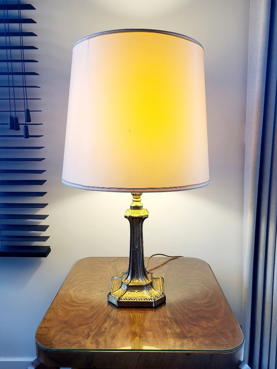Le pied de la lampe est en très bon état, avec quelques légères taches et traces d'usure sur l'abat-jour.