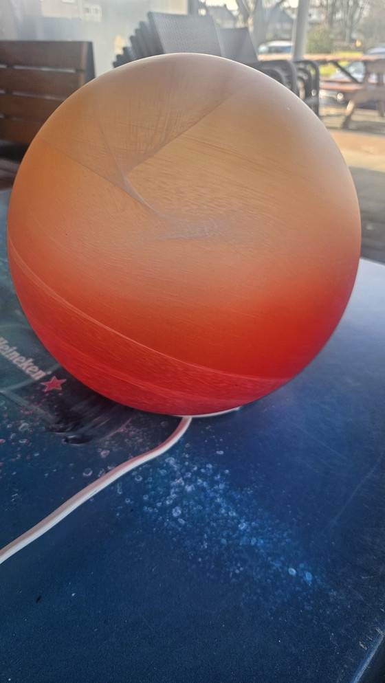 Magnifique lampe de table Wofi Leuchten Mars, reconnaissable à sa forme sphérique caractéristique et à son dégradé de couleurs chaleureux et atmosphérique, allant du rouge profond à l'orange/jaune, rehaussé d'un subtil tourbillon blanc dans le verre. Sa lumière diffuse crée une ambiance douce et cosy, faisant de cette lampe un élément central unique dans votre intérieur.
