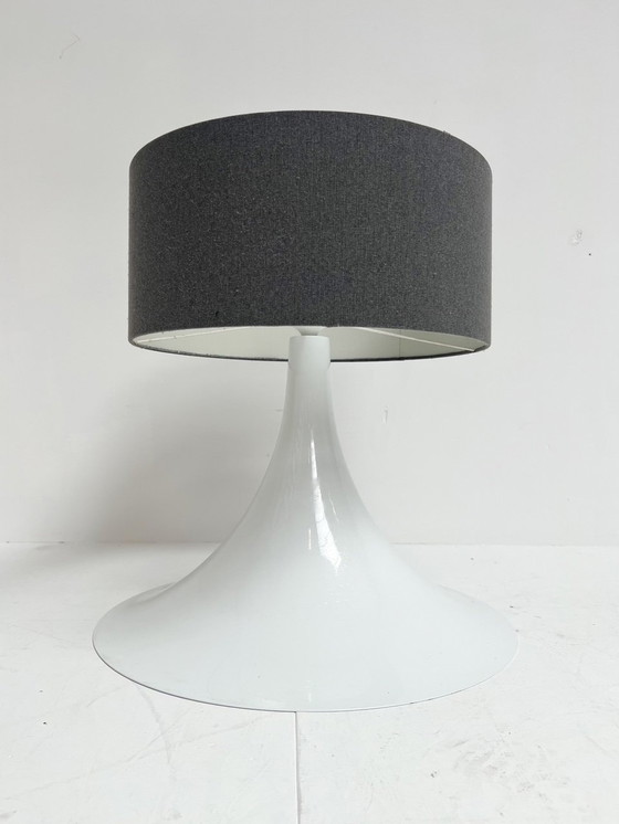 Cette lampe de table Space Age XL de Dijkstra est un véritable accroche-regard des années 1970 ! La lampe Trompette mesure 56,5 cm de haut et est en bon état. La base a un diamètre de pas moins de 52,5 cm. L'abat-jour anthracite a un diamètre de 45 cm et est également en bon état. Il n'est pas certain que l'abat-jour soit d'origine, mais combiné à la grande base blanche, c'est un tableau ! En état de marche avec un raccord E27 (ex. source lumineuse).