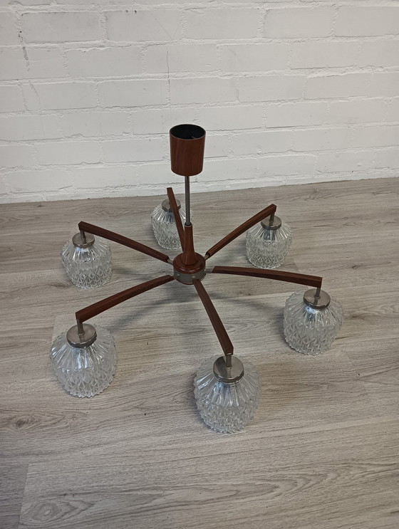 Lampe des années 1960, en teck et avec 6 magnifiques abat-jour en verre.