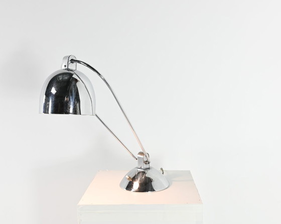 Lampe de table ou de bureau articulée des designers Yves Jujeau et André Mounique pour Jumo. Métal chromé, France C.1930. Patine du temps, bon état général.