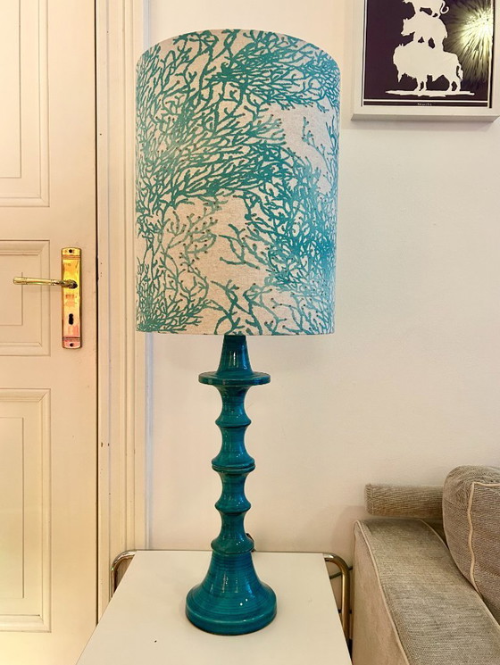 L'abat-jour cylindrique est recouvert d'un tissu semi-panama de haute qualité sur la France en couleur naturelle, imprimé d'un motif corallien turquoise. Le motif déploie un effet vivant, surtout à la lumière. Diamètre 35 cm, hauteur 40 cm.