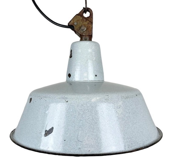 Suspension industrielle en émail gris, fabriquée par KWE en Pologne dans les années 1960. Intérieur de l'abat-jour en émail blanc. Partie supérieure en fonte. Douille en porcelaine compatible avec les ampoules E27. Câble neuf. Entièrement fonctionnelle. Poids : 1,5 kg.