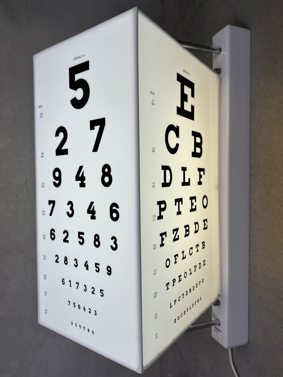 Applique murale unique provenant d'un cabinet d'ophtalmologie. Probablement des années 1980. Un véritable objet de décoration. S'intègre parfaitement dans un intérieur de style industriel. Lampe originale. Idéale pour créer une ambiance chaleureuse. Quatre tableaux d'acuité visuelle en plexiglas, pivotant autour d'un axe chromé. Équipée d'un interrupteur. Éclairage d'ambiance très agréable et élément décoratif exceptionnel. Dimensions : H 76 cm x L 32 cm x P 25 cm. Profondeur : 44 cm. Câble et prise inclus. Un coin a été réparé (voir photo, discret). Poids : 5,8 kg.