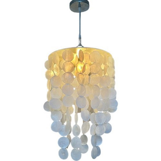 Cette magnifique lampe hollywoodienne italienne opalescente en véritables coquillages de nacre est vraiment spéciale. Avec plusieurs couches de magnifiques coquillages faits à la main, dans un modèle particulièrement beau. Avec un cadre capiz en véritable coquillage ! Ces lampes sont entièrement faites à la main et ne présentent aucun défaut. De vraies lampes qui sont magnifiques avec un intérieur vintage hollywoodien, et même un hôtel chic et moderne. Extra luxueux élaboré avec plaque de plafond de raccord chromé et câblage luxueux rembourré ! 😍 Les dimensions sont : Largeur 35 cm Hauteur 53 cm sans chaîne et plaque de plafond mesurée Hauteur avec fil mesurée 153 cm, fil raccourcissable !