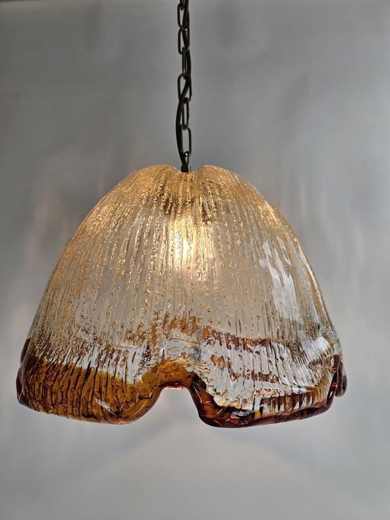 Cette magnifique lampe suspendue est fabriquée en verre épais avec une bordure orange frappante et des perles dorées incorporées dans le verre. Le design dégage un charme vintage et est parfait pour ajouter une touche d'élégance à n'importe quelle pièce. La lampe émet une lumière chaude et accueillante, idéale pour les salons, les salles à manger ou tout autre endroit où un éclairage d'ambiance est souhaité. Sa construction robuste et son design unique en font une véritable attraction.