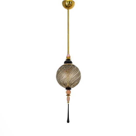 Un lustre-lanterne contemporain de style oriental, entièrement fabriqué à la main en Italie, présenté ici avec des éléments en laiton. La sphère ronde organique est fabriquée en verre de Murano soufflé à la main, fumé et texturé avec des motifs en spirale et en nid d'abeille. Elle est agrémentée d'un élégant bouton en verre de Murano noir et de sphères roses et noires. La hauteur totale peut être ajustée, raccourcie ou allongée. Idéal en groupe (voir photo), il est disponible en différentes couleurs et formes. Les sphères peuvent être fabriquées sur mesure dans les formes et les couleurs indiquées sur les photos. Câblé pour les Etats-Unis avec une douille E12 ou pour l'Europe avec une douille E14, et certifié UL, il peut utiliser deux ampoules de 40 watts.