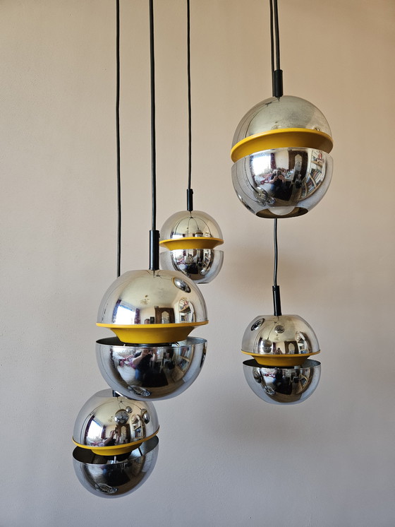 Cette magnifique lampe suspendue vintage Cascade est un véritable accroche-regard pour n'importe quel intérieur. La lampe se compose de 5 sphères en métal avec une finition argentée et des accents jaunes subtils. Le design est élégant et intemporel, parfait pour les amateurs de style vintage. La lampe est en bon état avec quelques signes d'utilisation qui ajoutent à son charme authentique. Les ampoules sont réglables en hauteur et mesurent 14 cm de diamètre et 20 cm de haut.