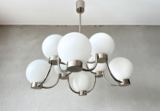 Lampe Sputnik emblématique de Boulanger, composée de 9 sphères blanches et montée sur une structure en acier inoxydable brossé. Une pièce design unique qui attire tous les regards et apporte instantanément une touche de luxe et d'originalité à votre intérieur.