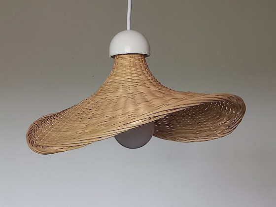 Lampe pendante en bambou en très bon état, jamais utilisée. Livrée avec un câble réglable de 100 cm et une prise E 27. L'abat-jour mesure environ 33 cm de diamètre et 18 cm de hauteur.
