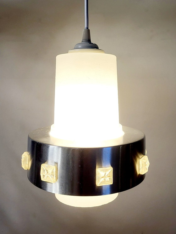 Lampe suspendue de l'ère spatiale, chromé et verre dépoli, années 1960-1970 Une lampe vintage typique de l'ère spatiale en métal chromé et verre blanc dépoli à l'intérieur. Le capuchon de plafond et le câblage ont été rénovés afin que la lampe puisse être suspendue en toute sécurité. Le fil est réglable en hauteur. Typique des années 1960 et 1970. Cette lampe donne une lumière chaude et agréable. Le câblage est en ordre de sorte que la lampe peut être branchée immédiatement. Une douille E27. La lampe est en bon état. Il y a des traces d'utilisation sur le métal sous forme de rayures et d'oxydation. Elles sont propres au temps et ne sont pas gênantes lorsque la lampe est suspendue. Dimensions hauteur : 23 cm et Ø 17 cm