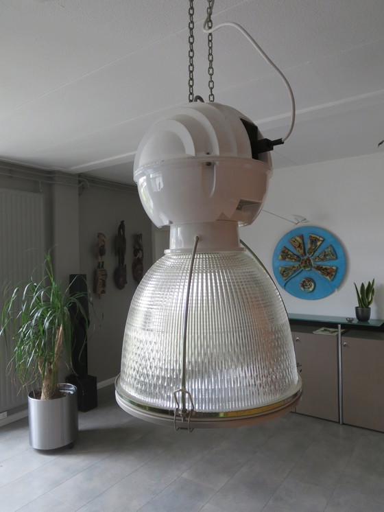 Ces lampes Holophane originales attirent tous les regards dans votre intérieur. Elles ont été produites dans les années 1960 en Angleterre et ont servi dans un atelier jusqu'à récemment. Elles ont un diamètre de 40 cm et une hauteur de 60 cm. À l'origine, il s'agit d'une lampe à pression de sodium de 200 watts. Elle donne une énorme quantité de lumière mais consomme également 200 watts par heure. L'intérieur, le transformateur et le condensateur ont été remplacés et les lampes sont équipées d'une douille normale avec une lampe LED globe à intensité variable de 7 watts. Les lampes sont impeccables et sans dommages. J'ai encore 2 ampoules dont une ampoule led globe dimmable de 7 watts blanc chaud.