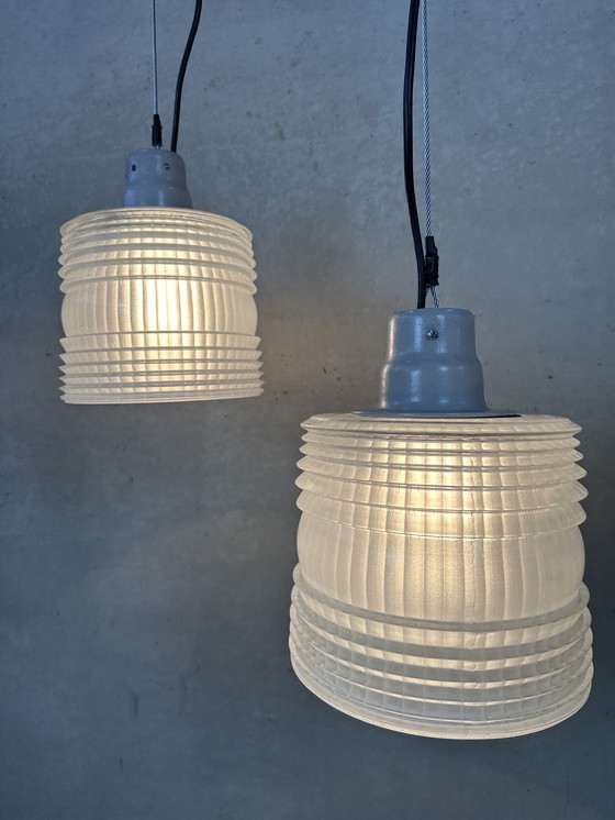 5x lampes suspendues industrielles vintage Europhane avec verre Holophane. Europhane est une société française spécialisée dans l'éclairage, qui produisait souvent des luminaires en verre Holophane. Le verre Holophane est un type de verre à structure prismatique qui rend la lumière diffuse et brillante. Cette combinaison d'Europhane et d'Holophane a donné naissance à des luminaires populaires, tels que les lampes suspendues, qui étaient souvent utilisées dans des environnements industriels et résidentiels. Ces abat-jour en verre Holophane très lourds sont livrés dans leur emballage d'origine (nouvel ancien stock) et ne présentent aucun défaut. Poids par lampe : 7kg ! Equipée d'un raccord e27 en porcelaine et d'un câble en acier avec œillet pour une suspension facile. Longueur totale illustrée : 130cm (à raccourcir au besoin). Diamètre de l'abat-jour : 25cm. Epaisseur du verre : 15mm ! Hauteur de la lampe : 31cm. Magnifique au-dessus de l'évier de la cuisine, de la table à manger, .... Ou dans un arrangement en cascade (voir les dernières photos). Prix par pièce. Nombre disponible : 2 x nouvel ancien stock, verre dépoli. 1 x neuf, verre clair. 2 x verre dépoli avec des signes d'utilisation (écaillage du verre mais sans fissures = moins cher). Le prix d'envoi est le prix pour l'envoi d'une lampe. L'enlèvement par coursier ou en personne à notre dépôt est bien sûr possible sur rendez-vous. Marqué et label de qualité dans la boîte. Qualité supérieure.