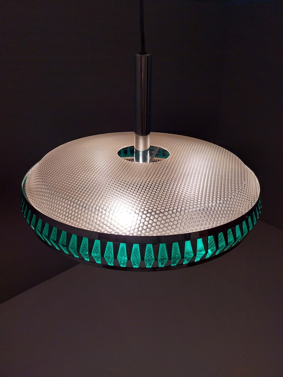 Une superbe suspension vintage des années 70, typique de l'ère spatiale, avec un design original en forme d'OVNI. Son large abat-jour rond est doté d'un diffuseur en plastique texturé à sa base et d'un contour chromé orné de touches de vert. Une fois allumée, la combinaison du plastique texturé et des accents verts crée une lumière chaleureuse et tamisée. Sa forme aérienne, évoquant une soucoupe volante, renforce l'aspect OVNI et lui confère un charme rétro indéniable. Un objet unique qui attirera tous les regards au-dessus d'une table à manger, dans un couloir, ou qui deviendra la pièce maîtresse d'un intérieur vintage ou mid-century. La lampe est en excellent état vintage, avec de légères traces d'usure normales pour son âge.