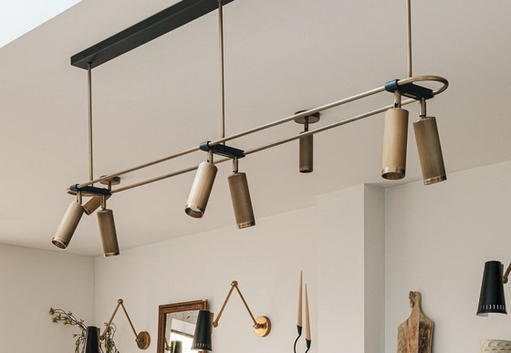 La suspension Spot offre une solution d'éclairage élégante, composée de six spots en laiton suspendus à un système de double rail épuré. Disponible en deux longueurs standard, cette suspension est un système d'éclairage raffiné et très fonctionnel, idéal pour illuminer les plans de travail, les espaces repas et les coins-repas.