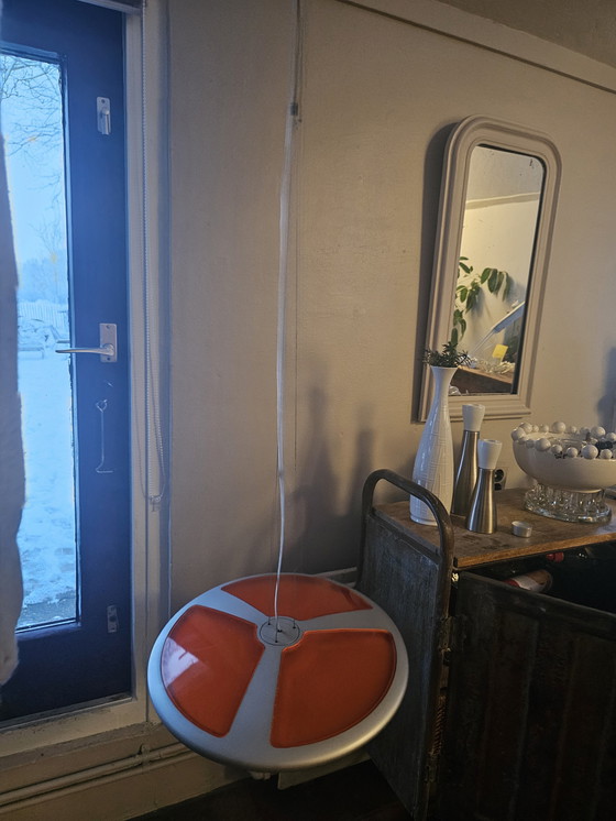 Suspension vintage, suspendue par un câble central et trois fils réglables. Conçue et fabriquée par Tobias Grau à Munich vers 1990. En bon état vintage, avec une minuscule rayure (voir photo) et quelques traces de saleté sous la bordure orange (voir photo). Démontée du plafond en état de marche.