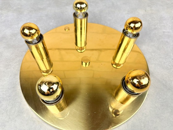 Magnifique design Mid Century. Applique ou plafonnier des années 1980. Base ronde en laiton avec 5 lampes. Design simple mais élégant en bon état.