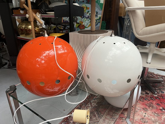 Les lampes ont très bien résisté à l'épreuve du temps, avec de légères rayures et une petite bosse sur l'ampoule orange. Les lampes ont été nettoyées et équipées de nouveaux câbles en acier et d'un nouveau câblage. Les mécanismes de suspension d'origine sont présents.