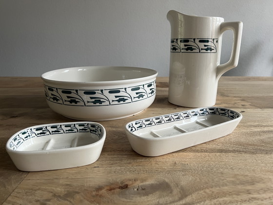 Cet ensemble de toilette vintage 4 pièces apporte une touche de charme classique à votre salle de bain. Composé d'un pichet, d'une bassine et de deux porte-savons, chaque élément est orné d'un motif distinctif. Remarque : La bassine présente un petit éclat, comme indiqué sur la photo.