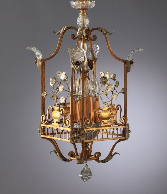 Cette exquise lanterne Banci des années 1980 est une pièce vintage étonnante qui ajoute de l'élégance à n'importe quel espace. Réalisée en métal complexe et ornée de délicats éléments en verre, elle présente une magnifique finition dorée. Le design de la lanterne présente des motifs floraux et des accents de cristal, ce qui en fait une pièce maîtresse parfaite pour un décor classique ou d'inspiration vintage.