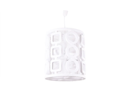 Lanterne modèle « Omega », ajourée en plâtre sur une structure composite, de forme circulaire, à décor de cercles et de carrés. Travail d’artiste de petite série. Dimensions : H 70 x D 60 cm Référence : LS62522411A