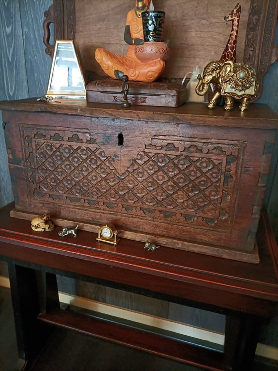 - Fabriqué en bois de haute qualité, ce coffre présente des sculptures détaillées qui soulignent son allure antique.