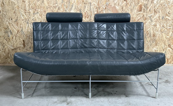Le Volare est conçu par Jan Armgardt et produit par Leolux. Ce généreux canapé à deux places occupe un espace modeste. Le canapé a manifestement été utilisé, mais il est en très bon état compte tenu de son âge. Les coutures ne sont pas abîmées. La structure est en acier inoxydable. Les pieds sont munis de caches de protection transparents mats. Léger dommage, à peine visible (voir photo de détail).