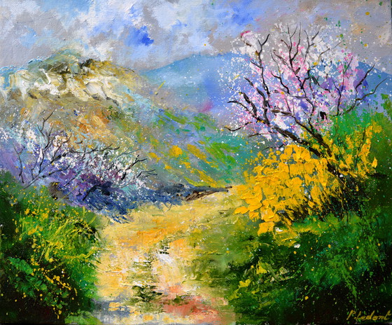 Un chemin doré serpente doucement à travers un rêve de printemps, où les fleurs rougissent dans des teintes de lilas et de rose, et où les pétales jaunes tombent comme des rires dans la brise. Les montagnes nous regardent de loin, leurs sommets embrassés par la brume, tandis que les nuages dérivent dans un ciel inondé de mémoire et de lumière. Chaque coup de pinceau chante la renaissance, le retour de la chaleur, les arbres tranquilles qui se débarrassent de leur sommeil pour s'épanouir à nouveau dans la joie.