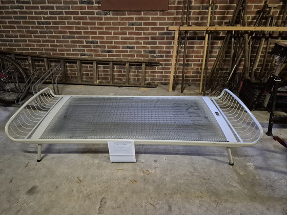Un magnifique canapé-lit vintage signé RAWI. Cette pièce unique a été fabriquée par la célèbre maison N.V. Rawi Fabrieken Winschoten. Sa structure en métal blanc allie robustesse et élégance.