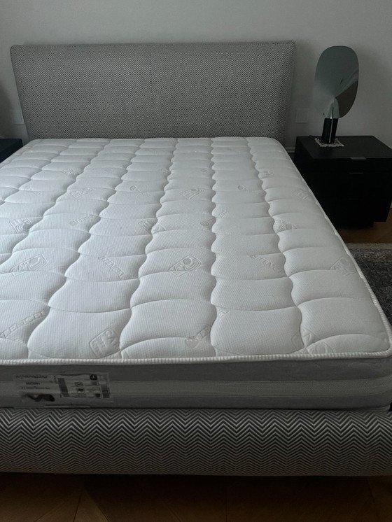 - Son design épuré et contemporain se distingue par une tête de lit et un sommier magnifiquement revêtus d'un subtil motif chevron gris, apportant une touche de texture et de style.