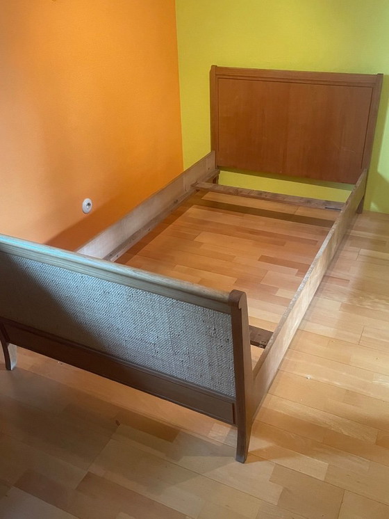 Un magnifique lit de style mid-century, harmonieux et élégant, avec un cannage viennois en cannage remarquablement bien conservé. Le bois présente une teinte chaleureuse et agréable. Malgré son apparence délicate, il est très robuste et facile à démonter. Il peut également servir de lit double.