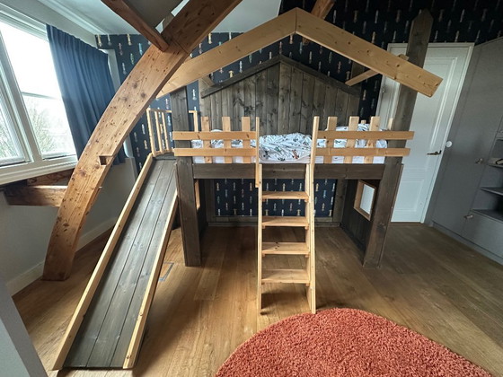 Lit mezzanine fait main avec toboggan – bois massif – comme neuf