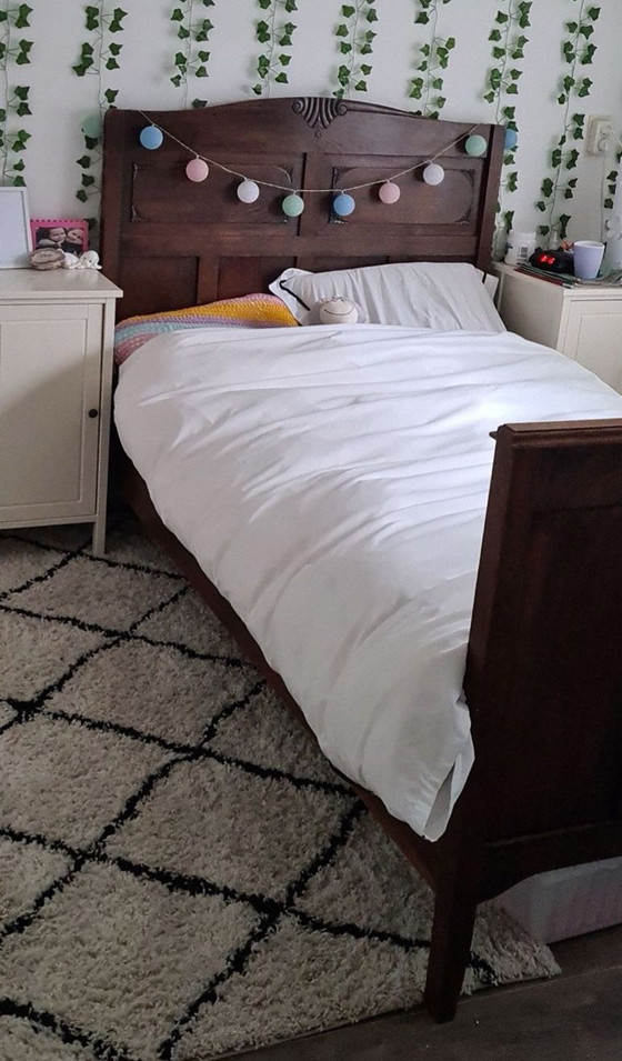 Magnifique cadre de lit en bois massif brun foncé avec une tête de lit finement sculptée. Style classique et grande robustesse.