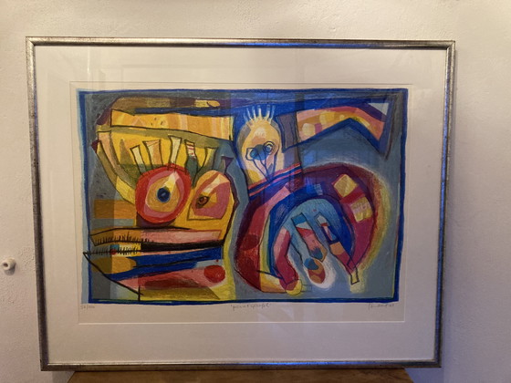 Sérigraphie graphique avec peinture acrylique par Geert Vrijdag. Œuvre colorée. La sérigraphie est encadrée. Édition limitée, numéro 56 sur une série de 140. Dimensions : 110 cm X 88 cm.