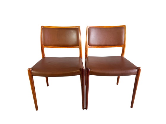 Nous proposons à la vente un magnifique lot de 2 chaises Niels Otto Moller des années 1960. Il s'agit du modèle 80, fabriqué en cuir de haute qualité et en bois de palissandre.