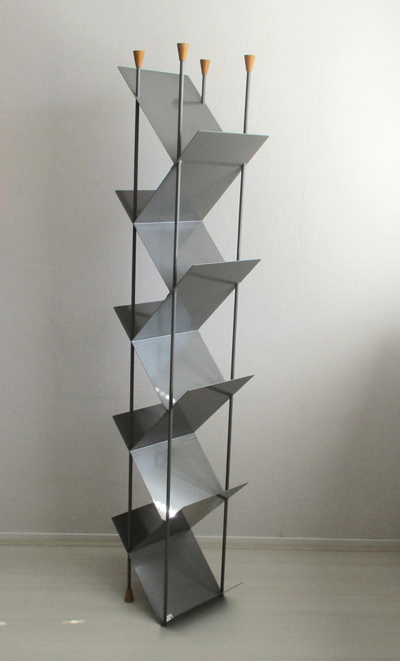 En très bon état, étagère design en métal gris de Lourens Fisher (pour livres, magazines, prospectus, DVD, CD, etc.). Hauteur 158 cm, largeur 25 cm, profondeur 33 cm. Total de 9 compartiments. Montants munis de capuchons en hêtre + un capuchon de rechange. Un léger dommage au bas de l'étagère, non visible (voir photo).