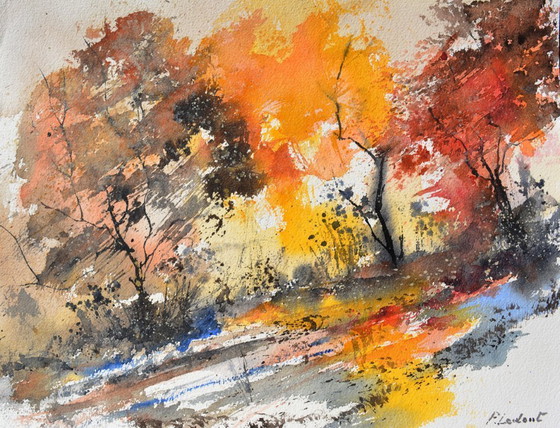 Cette œuvre d'art captivante présente un paysage automnal vibrant dans des tons riches et chauds. Les arbres, principalement d'un orange vibrant et d'un rouge profond, se détachent sur un fond de lumière dorée. L'artiste a utilisé des coups de pinceau audacieux et des éclaboussures pour créer un effet dynamique et texturé, évoquant une douce brise agitant les feuilles. Une fine bande de bleu traverse la scène, suggérant un ruisseau, ajoutant un contraste saisissant aux couleurs chaudes environnantes. Les techniques mixtes ajoutent de la profondeur, capturant l'essence de la nature en transition. Cette œuvre remarquable plonge le spectateur dans une atmosphère de tranquillité et de beauté éphémère.