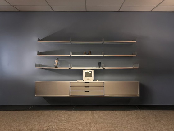 Padova USS est un meuble mural modulaire en aluminium composé de trois étagères et d’un buffet suspendu avec tiroirs et espace de rangement. Ce système offre à la fois un espace d’exposition ouvert et un espace de rangement fermé. Grâce à sa fixation suspendue, il reste spacieux et bien organisé.