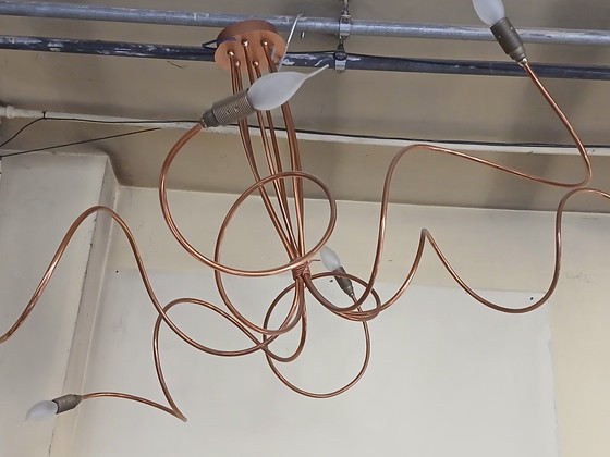 Ce lustre moderne, au design unique et sinueux, apporte une touche d'élégance à tous les espaces. Fabriqué en métal couleur cuivre, il offre une esthétique contemporaine qui s'intègre harmonieusement aux intérieurs modernes et minimalistes.
