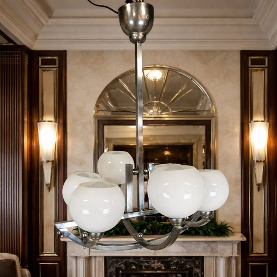 Lustre Art Déco ancien en chrome avec boules de verre, 1920
