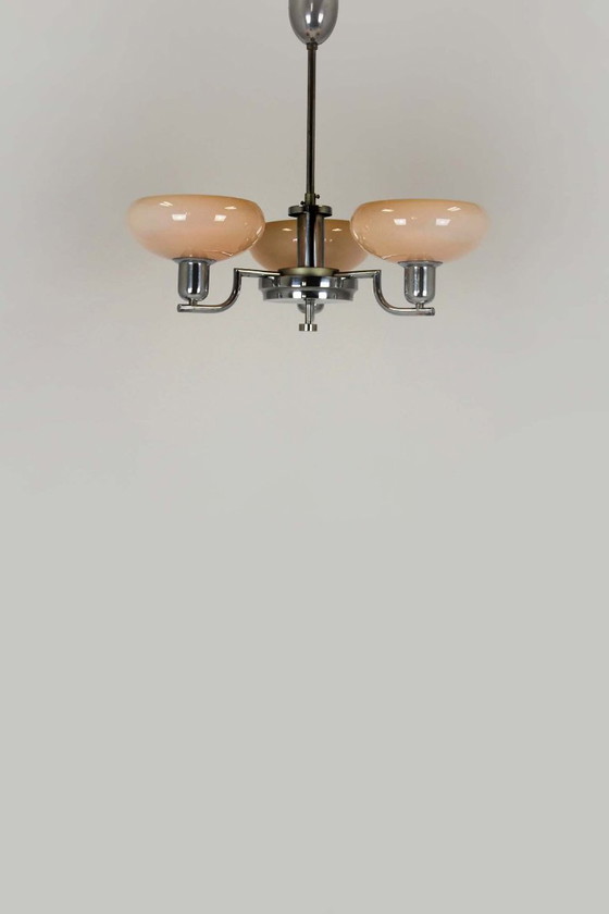 Suspension Napako, fabriquée en Tchécoslovaquie dans les années 1940. Elle possède trois bras avec abat-jour en verre d'origine et une structure en métal chromé. Une pièce élégante et authentique du design tchèque vintage.