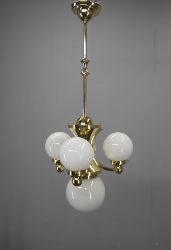 Ce lustre Art déco à quatre flammes, utilisé à l'origine dans les intérieurs de Gocar dans les années 1910-1920, est une pièce maîtresse magnifiquement restaurée pour tout intérieur ancien ou moderne. Le luminaire est en laiton poli et raffiné et a été recâblé professionnellement pour une utilisation moderne. Il peut accueillir quatre douilles E25/E27 (3x60W max) sur deux circuits et est compatible avec les normes électriques américaines. La tige centrale peut être raccourcie pour s'adapter à la hauteur de votre plafond. Idéale pour les entrées, les salles à manger ou les restaurations d'époque, cette lampe intemporelle apporte une touche Art déco authentique grâce à son design géométrique épuré et à sa finition brillante.