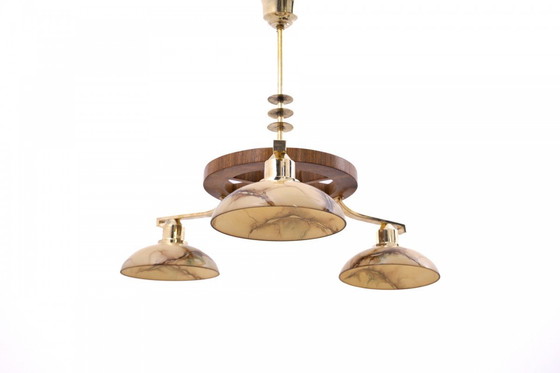 Une merveilleuse combinaison de différents matériaux : bois, métal et verre. La lampe a trois bras en métal avec des abat-jours en verre beige avec des veines plus foncées.
