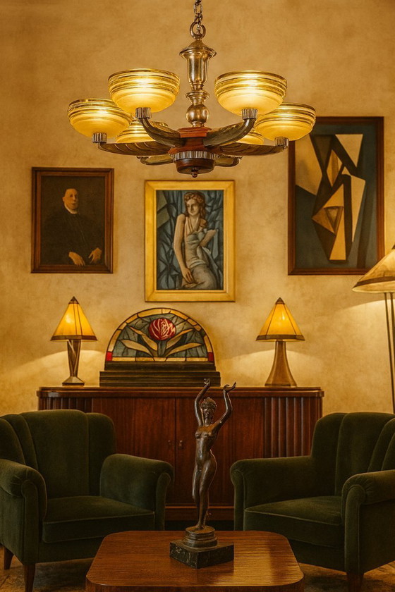 Modèle à cinq bras de lumière, structure associant bois massif, métal argenté et tulipes en verre pressé ambré strié. Le fût central est en métal argenté tourné, reposant sur un moyeu central en bois. Les bras sont en métal, de forme feuillagée, typiques de la production Art Déco. Chaque bras supporte une tulipe en verre épais de teinte ambrée, cerclée de lignes dorées. Suspension par chaîne d’origine avec pavillon en métal. L’électricité est fonctionnelle. L’état général est satisfaisant, avec une patine conforme à l’âge. On note la présence de quelques piqûres d’insectes anciennes dans le bois, visibles sur les photographies, sans fragilisation de la structure. Pas de fêlures ni d’éclats sur les verrerie H50 x L75 x P75